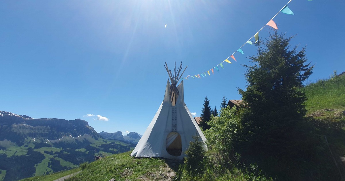 Stolz steht das brandneue Tipi auf der Erhöhung neben dem Ferienhaus. Es steht unseren Feriengästen über die Sommersaison zum Bräteln, Feiern, Übernachten zur Verfügung. Holz gibts gratis dazu.
